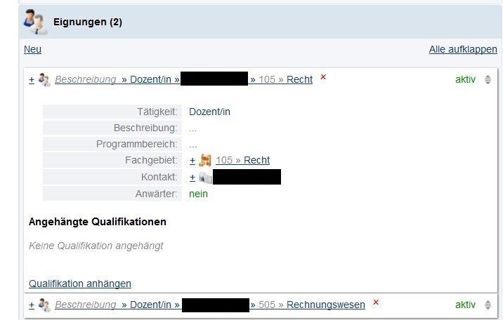 Werden einer Eignung mehrere Qualifikationen zugeordnet, so werden all diese Qualifikationen zur Person bei den Veranstaltungen des entsprechenden Fachbereichs angezeigt.