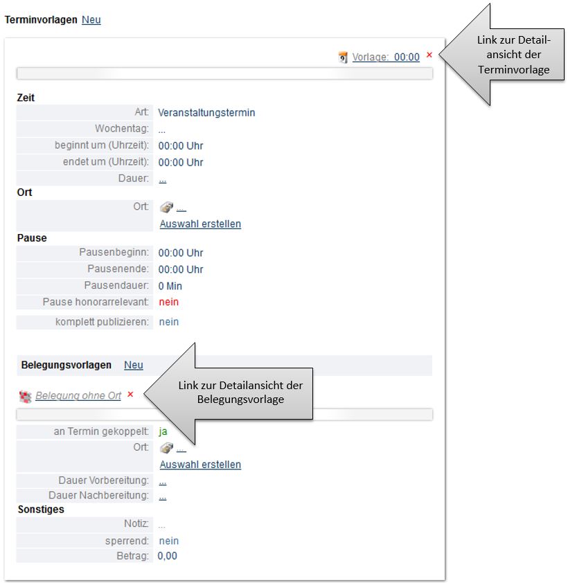 Bei Veranstaltungen, die regelmäßig einmal wöchentlich im selben Ort (Raum) stattfinden, reicht die Terminvorlage mit der zugehörigen Belegungsvorlage aus, um die notwendigen Vorgaben für die zu erstellenden Termine und Belegungen zu hinterlegen.