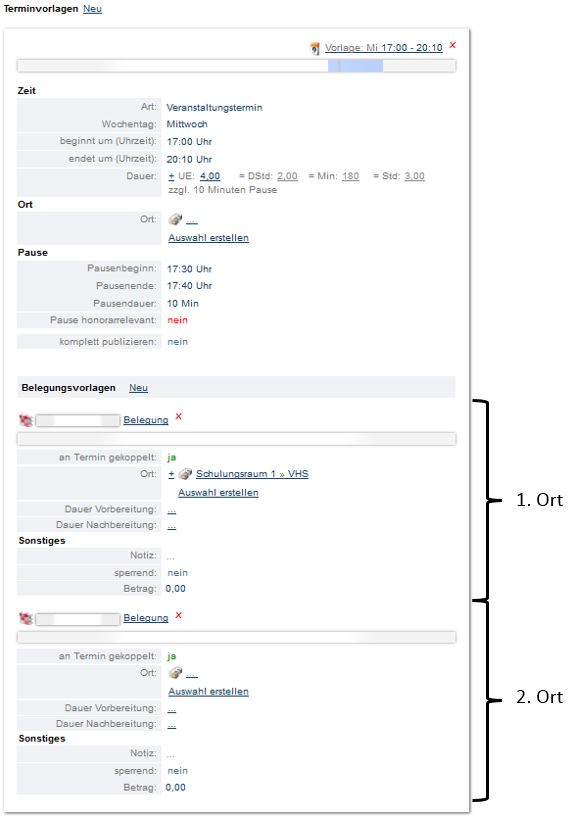 Findet eine Veranstaltung an zwei Orten statt (Bsp. Theatergruppe: ein Raum zum Umkleiden und ein Raum zum Proben), dann muss eine weitere Belegungsvorlage der Terminserie hinzugefügt werden. Dies geht über den Link „Neu“ neben dem Wort „Belegungsvorlage“ in der Terminvorlage.