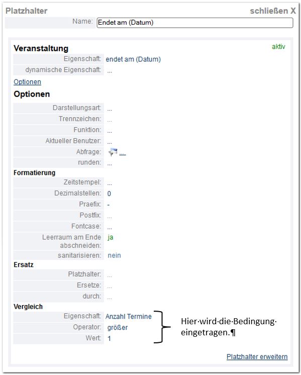 Wenn zB. in einer Veranstaltung bei der Eigenschaft Teilnehmerinfo ein Text hinterlegt wurde und dieser mit zB. einer Verion Name Druckinfo versehen wurde, kann man über die Platzhalter auf die Versionen zugreifen.