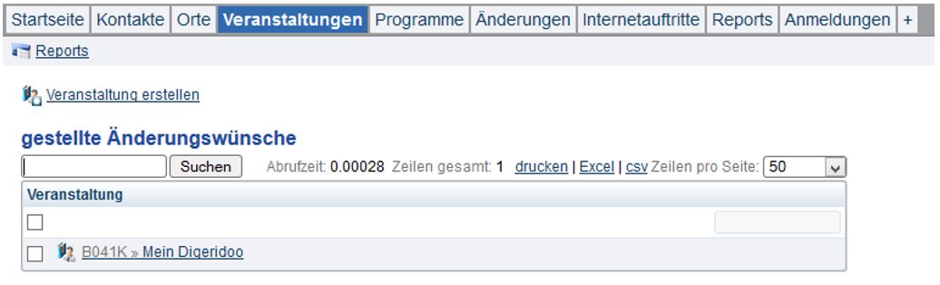 Online eingereichte Veranstaltungen finden Sie am einfachsten im Objekt „Veranstaltungen“ im Systemreport „gestellte Änderungswünsche“. Hier befinden sich ausschließlich die Veranstaltungen, die von Honorarkräften bearbeitet und deren "Planung abgeschlossen" wurde.
