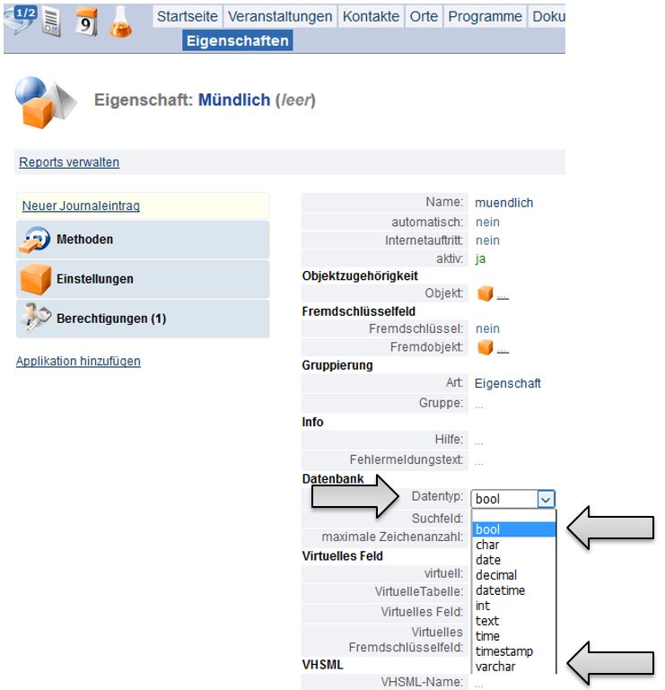 Der Name der Datenstruktur kann in der Applikation direkt abgelesen werden. Die Eigenschaft wird in der Applikation jedoch mit ihrem Alias angezeigt. Um an den tatsächlichen Namen der Eigenschaft zu kommen, klicken Sie das blaue Dreieck links der Eigenschaft an, dadurch wird nun die Eigenschaft angezeigt.