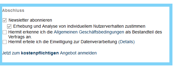 Hiermit ist die Einrichtung der Schnittstelle erfolgreich abgeschlossen. Von nun an erscheint im Kontext einer neuen Anmeldung das Dialogfeld zur Registrierung zum Newsletter.
