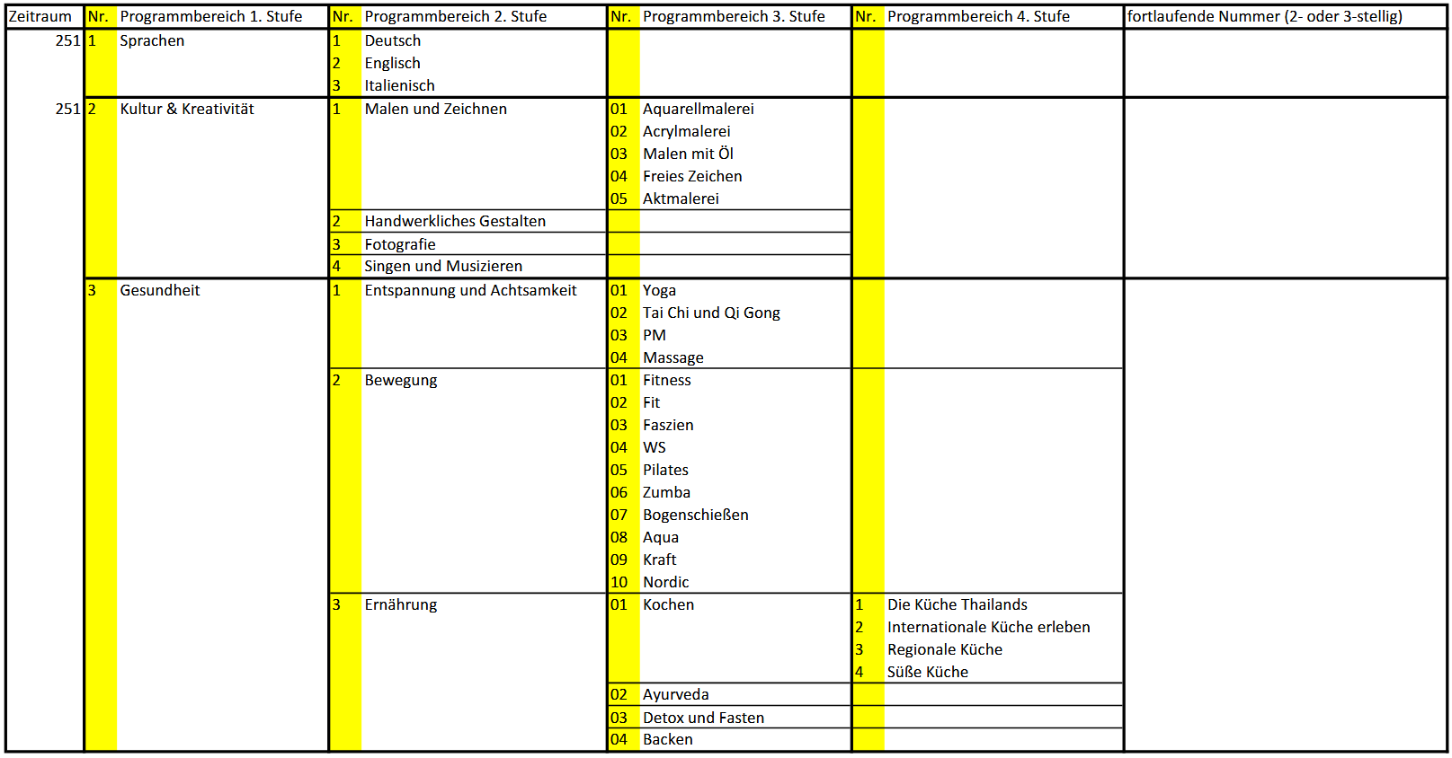 - Die Stellenanzahl der fortlaufenden Nummer darf nicht überschritten werden. Die Anzahl der Stellen in der fortlaufenden Nummer richtet sich nach der höchsten Anzahl an Veranstaltungen in einem Bereich. Überschreitet man z. B. im gewählten Zeitraum (Spalte "Zeitraum") in einem der Programmbereiche (Spalte "Programmbereich 2", "Programmbereich 3" oder "Programmbereich 4") die 99 Veranstaltungen, muss die fortlaufende Nummer durchgängig 3-stellig sein.