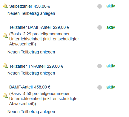 - Teilzahler BAMF-Anteil mit der Berechnungsart: pro teilgenommene Unterrichtseinheit (inkl. entschuldigter Abwesenheit)