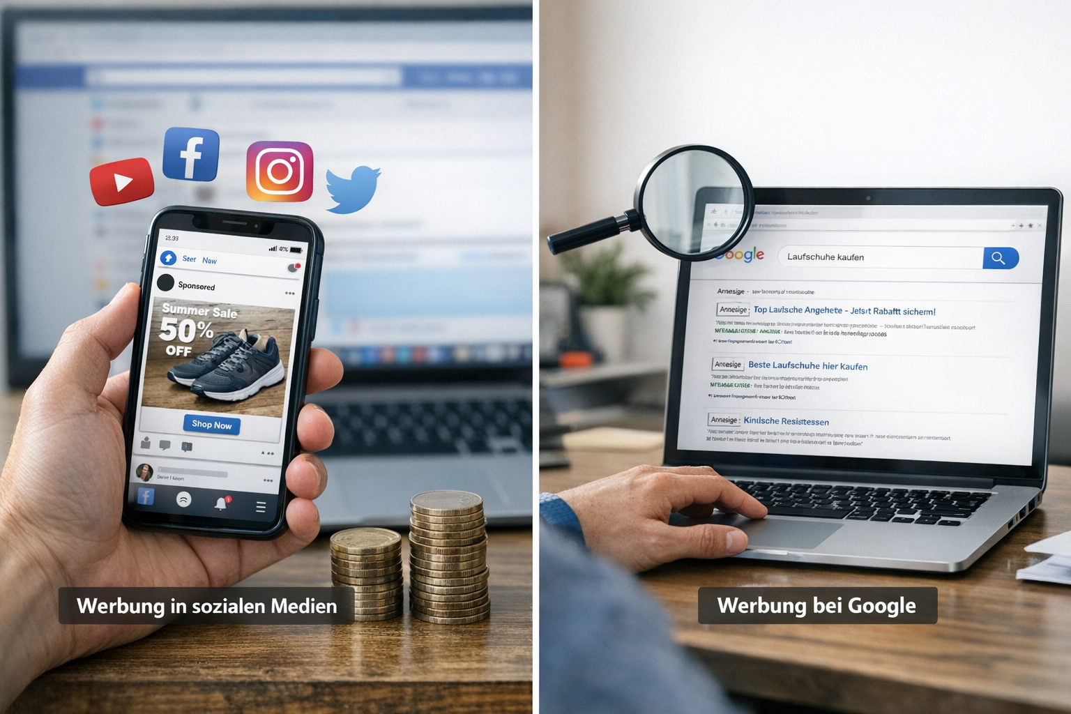 Bezahlte Werbung kann man an zwei Stellen setzen. Entweder im klassischen Internet über Google oder andere Suchmaschinen oder auch in den sozialen Medien.
